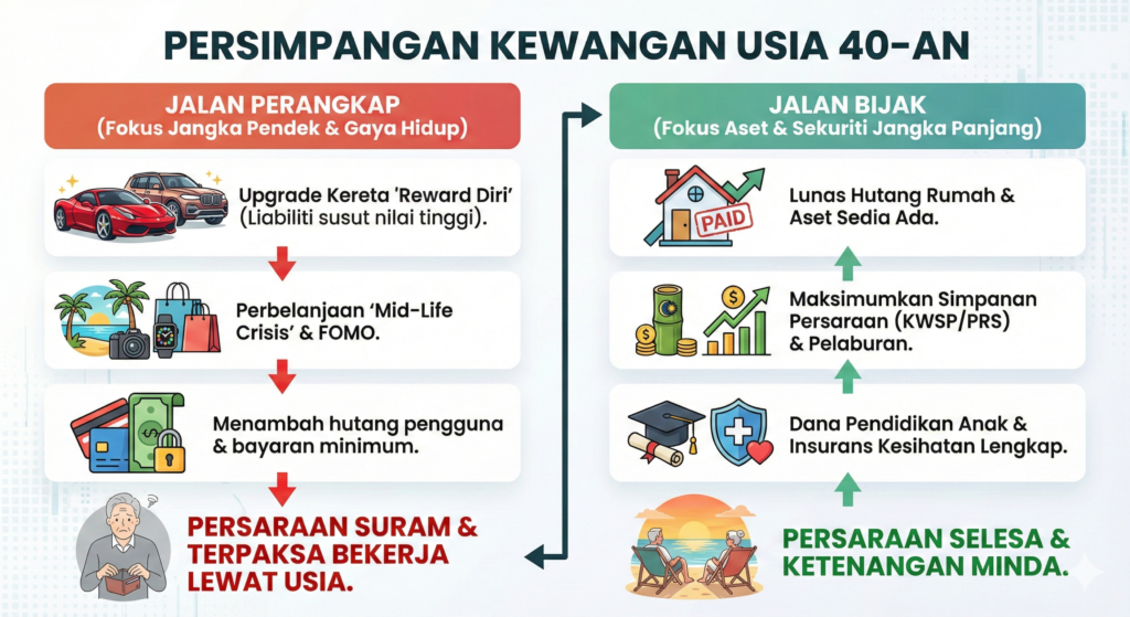 Perangkap kewangan lelaki umur 40 ialah apabila pendapatan anda meningkat, perbelanjaan anda turut meningkat pada kadar yang sama atau lebih cepat. Inilah yang dikenali sebagai lifestyle creep atau peningkatan gaya hidup. Perangkap ini bukan sekadar tentang membeli barang-barang mewah, tetapi lebih berbahaya lagi, ia adalah tentang mengunci kos tetap yang lebih tinggi yang akan mengikuti anda selama bertahun-tahun. Apabila anda membeli rumah yang lebih besar atau kereta yang lebih mahal, anda bukan hanya membayar lebih sekali, tetapi setiap bulan.