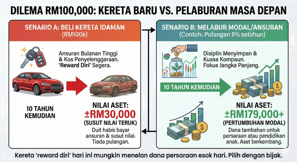 Setiap ringgit yang anda belanjakan untuk gaya hidup hari ini adalah ringgit yang tidak bekerja untuk anda di dalam pasaran pelaburan. Jika anda melabur $500 sebulan bermula pada umur 35 tahun dengan pulangan purata 7%, anda boleh mengumpul hampir $500,000 menjelang umur 65 tahun. Namun, jika anda menunggu sehingga umur 45 tahun untuk memulakan pelaburan dengan jumlah yang sama, anda hanya akan mempunyai kurang daripada separuh jumlah itu. Anda telah kehilangan dekad pelaburan paling berkuasa dalam hidup anda.