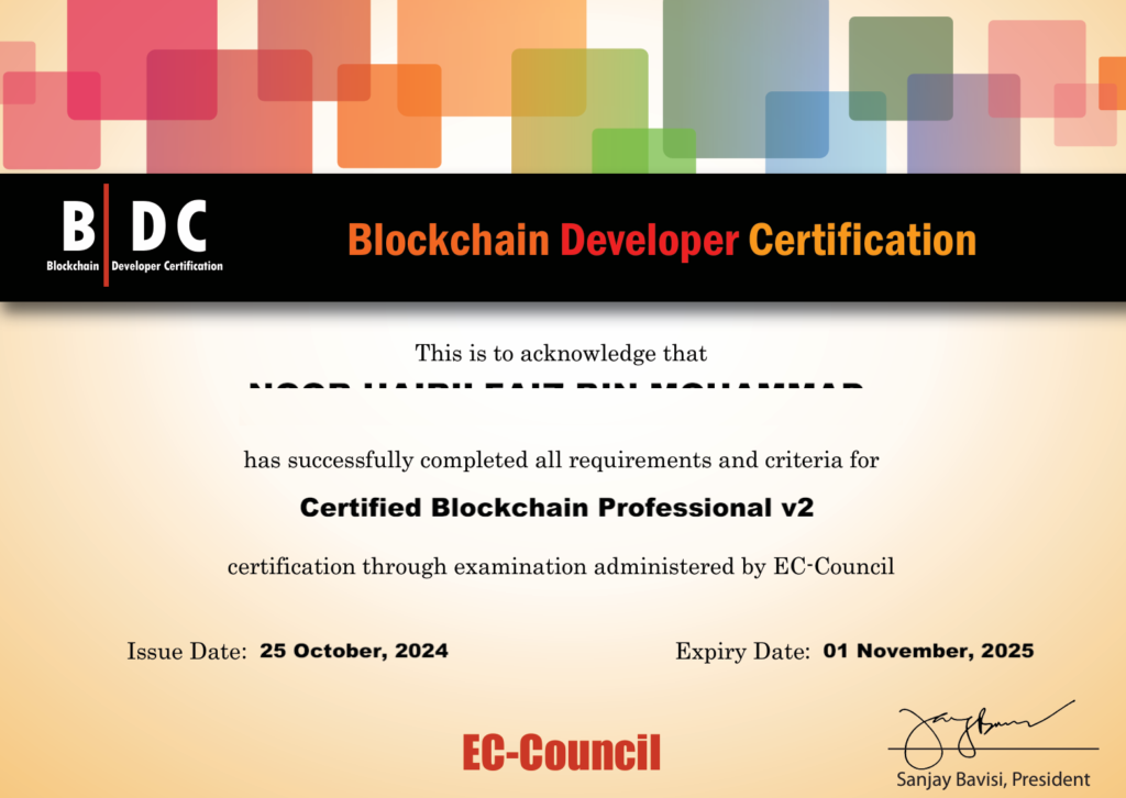 Pada bulan Oktober 2024 aku ada mengambil kursus dan menduduki ujian untuk mendapatkan sijil “Blockchain Developer” dari EC-Council. Alhamdulillah aku berjaya mendapatkan professional cert.